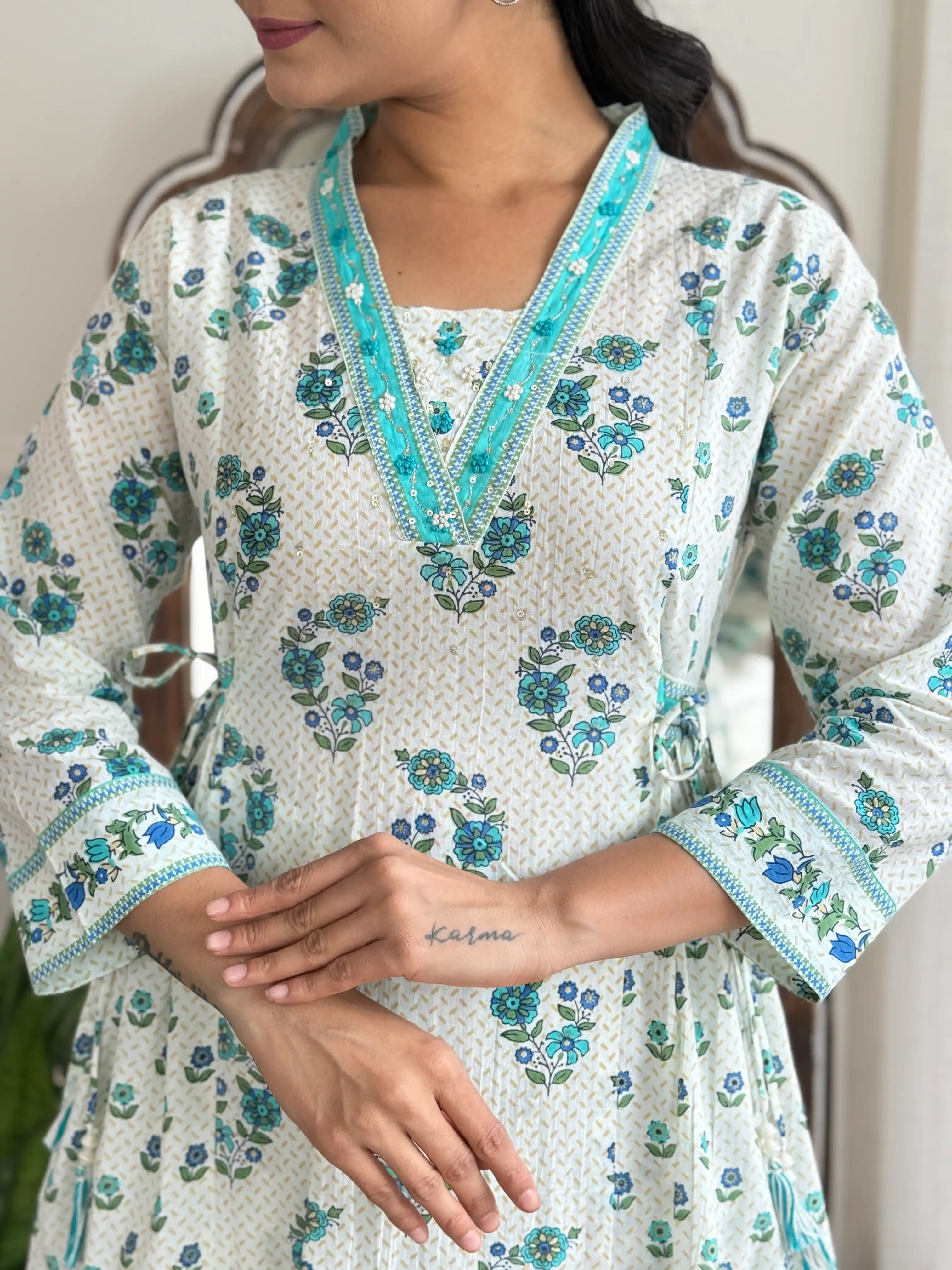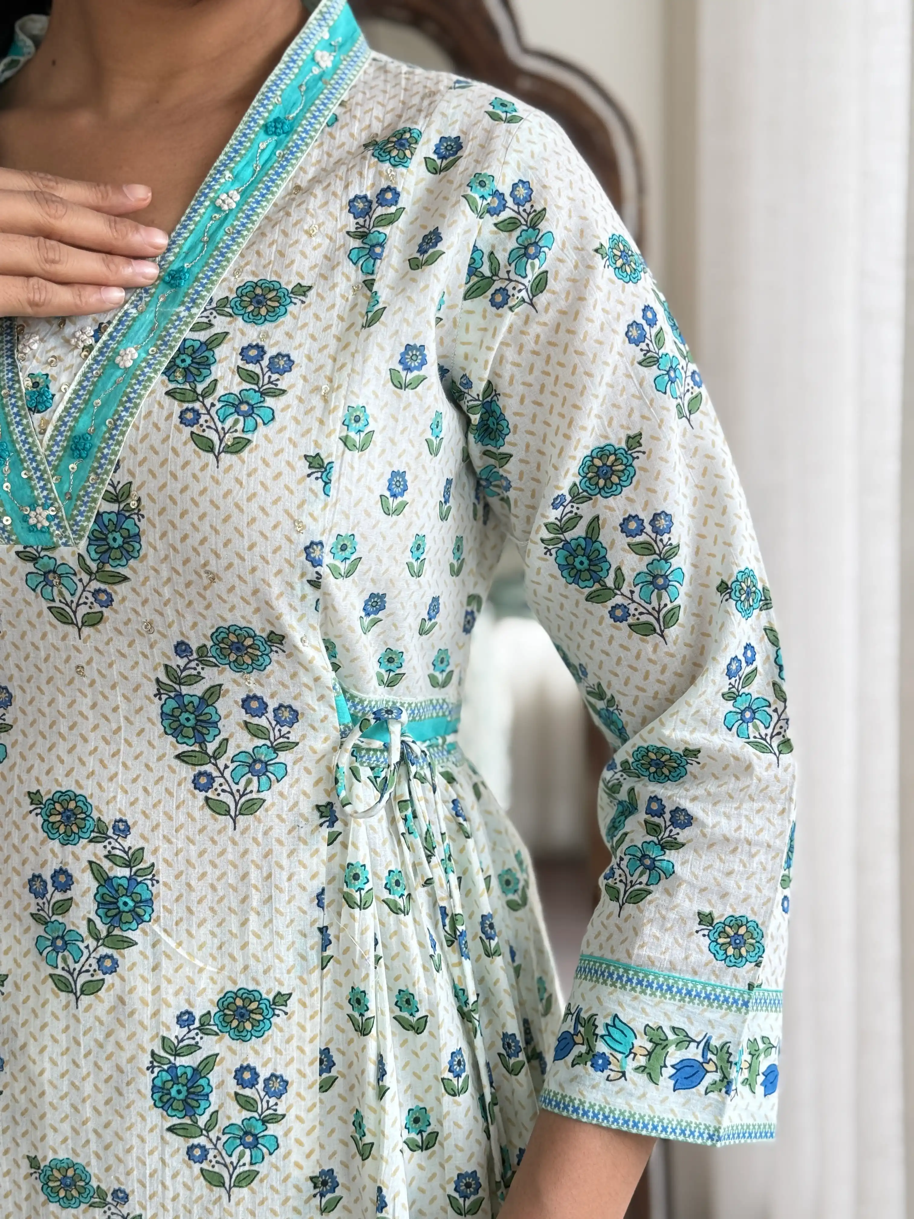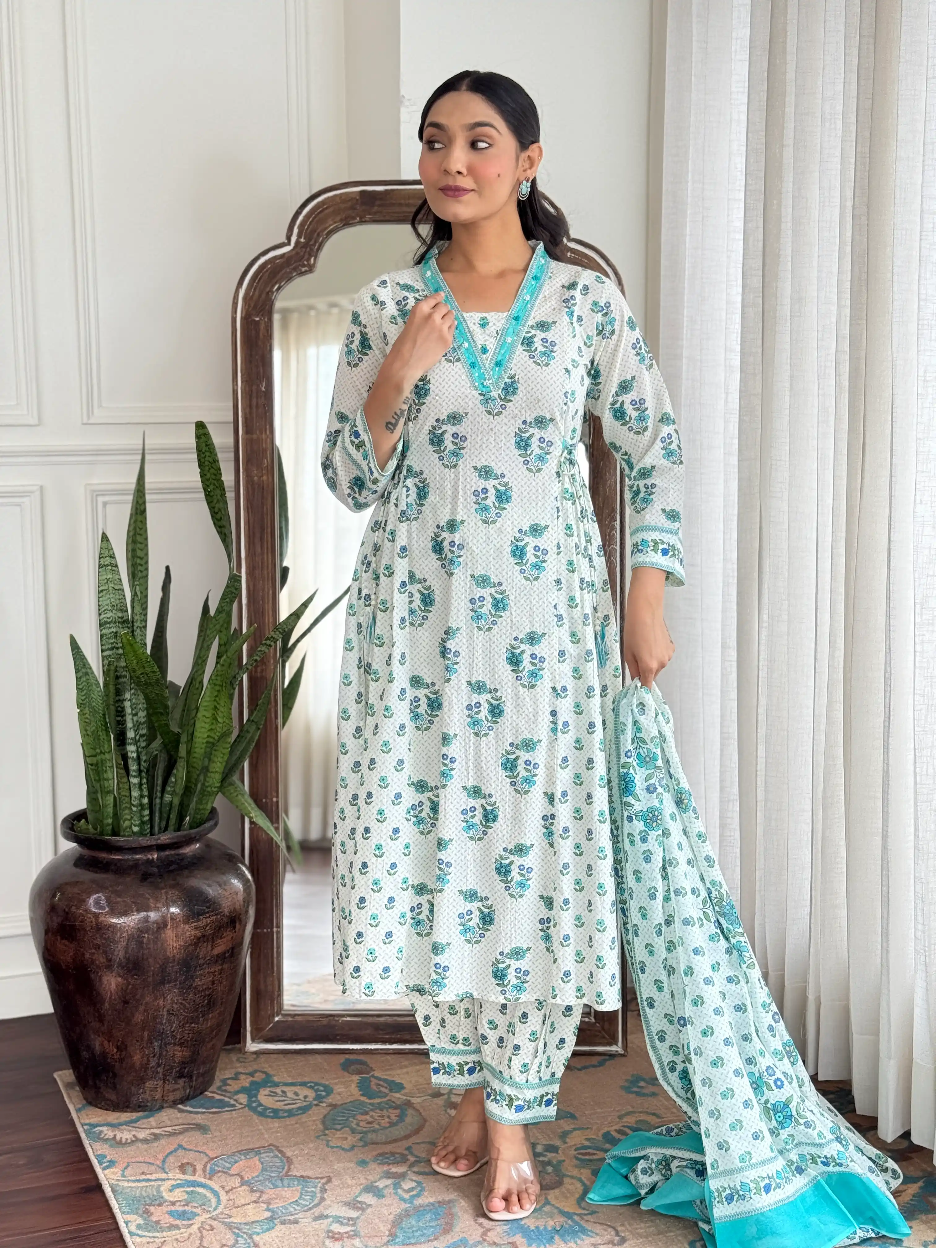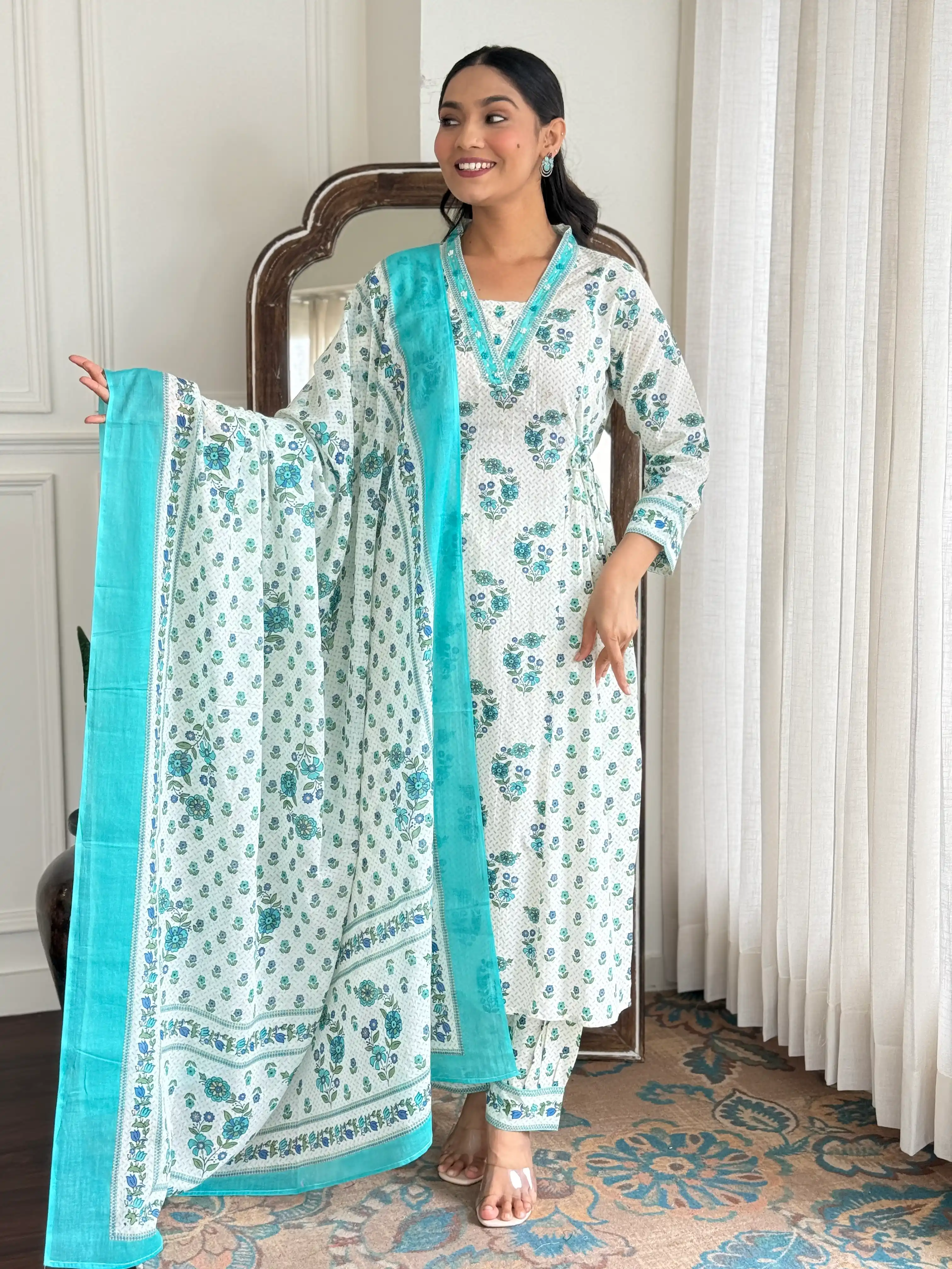 Light Blue Cotton Hand Work V neck Printed Kurta Pant Dupatta Set