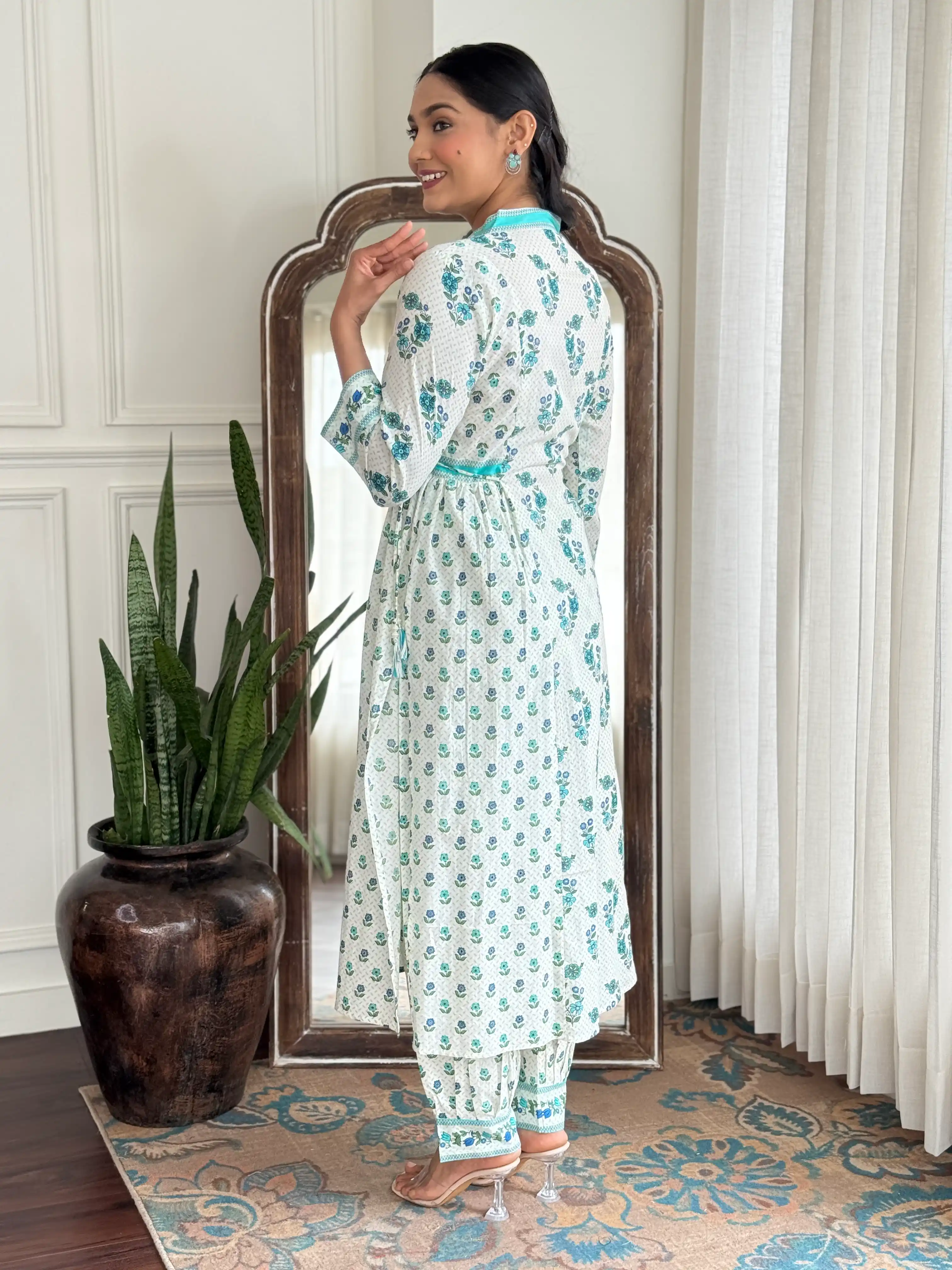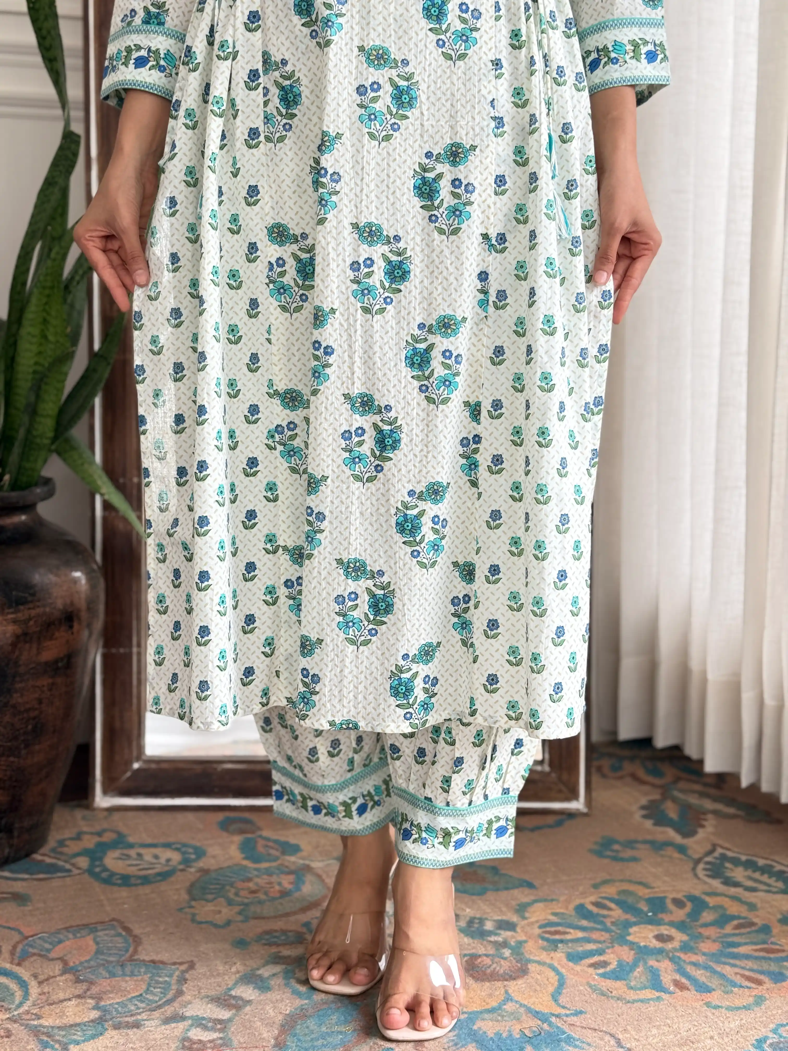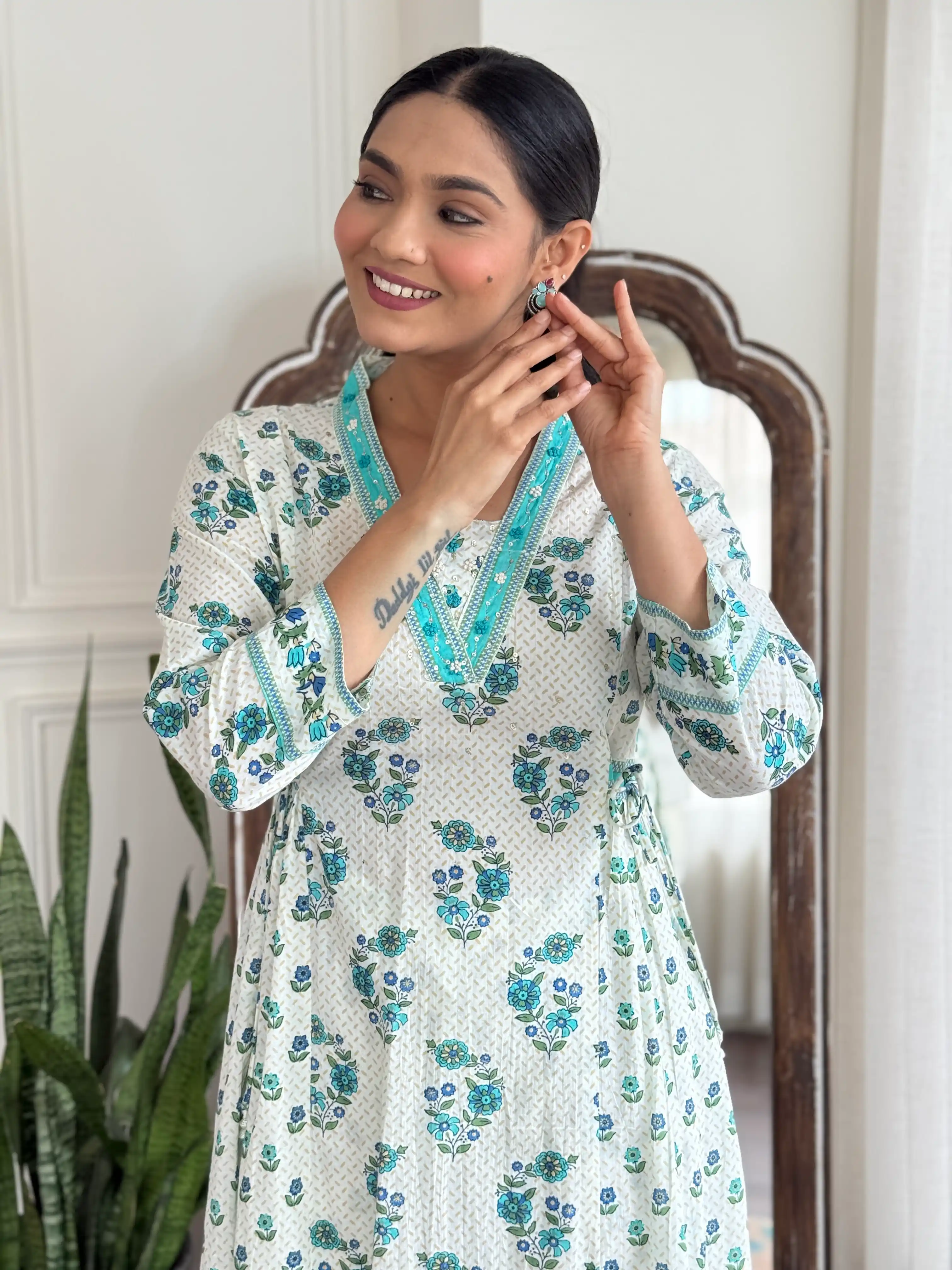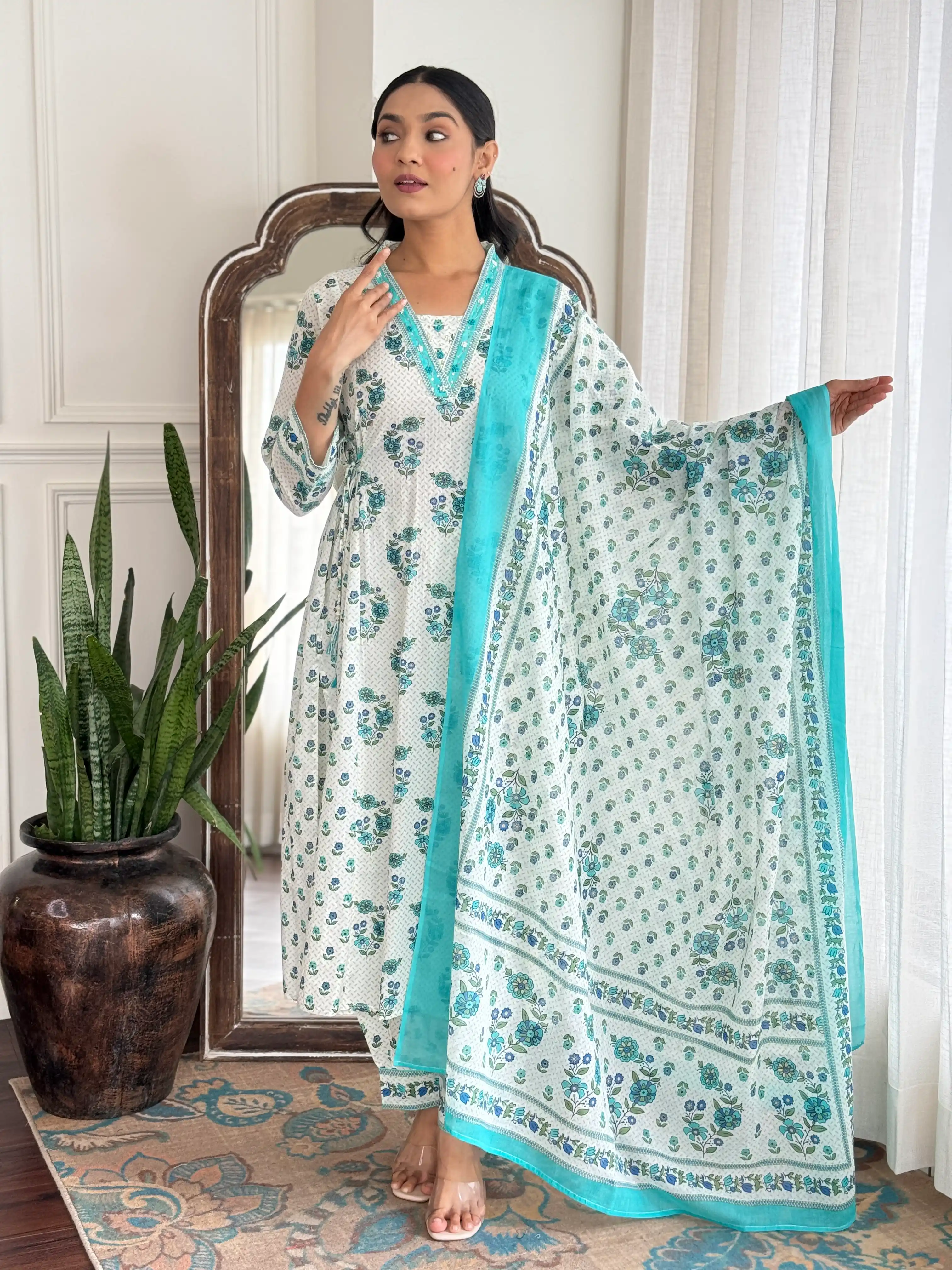 Light Blue Cotton Hand Work V neck Printed Kurta Pant Dupatta Set