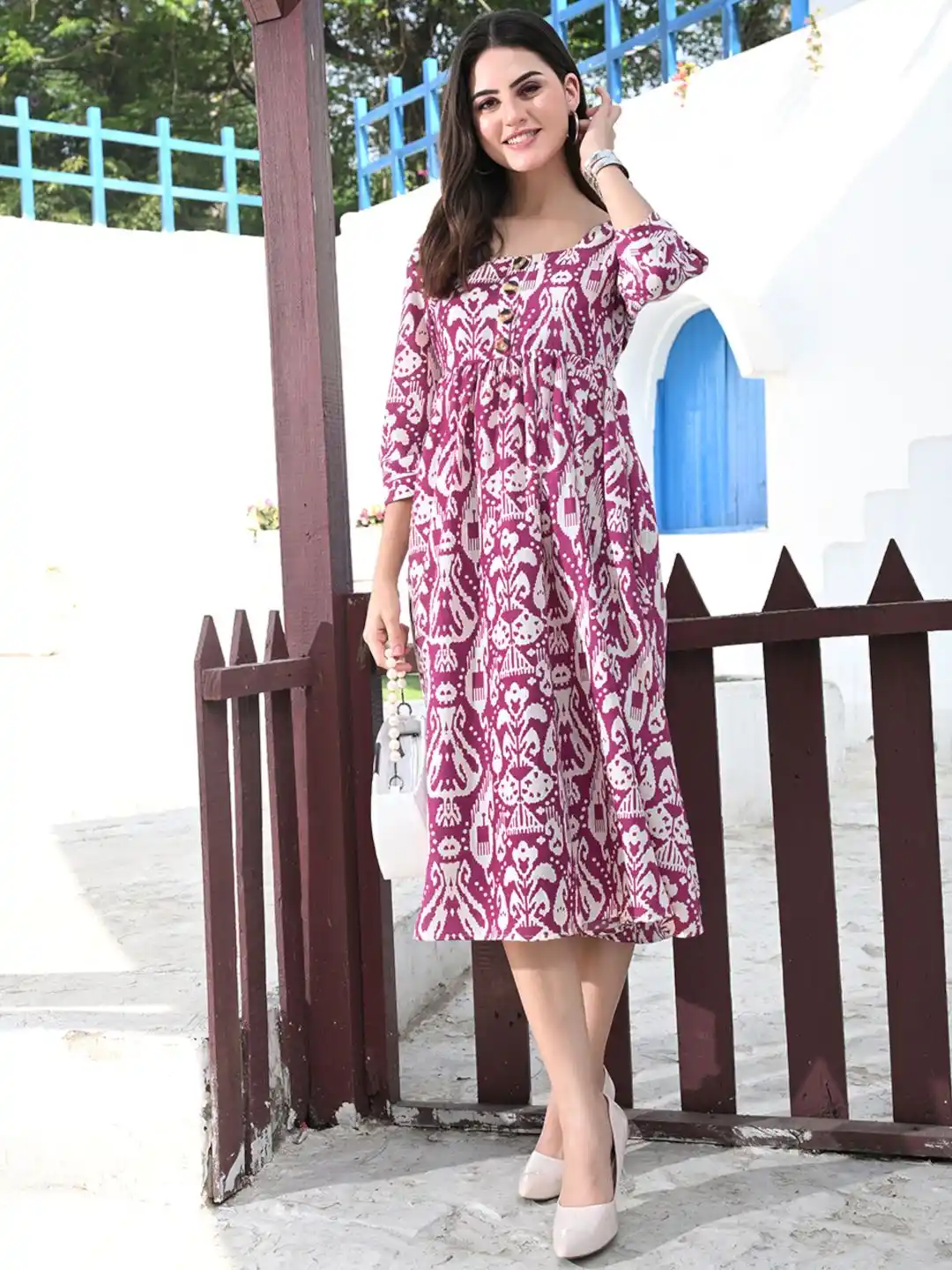 Berry Wine Traditional Ikat-Inspired Block Print Ethnic Printed Flared Midi Dress / Casual Ethnic Wear Dress