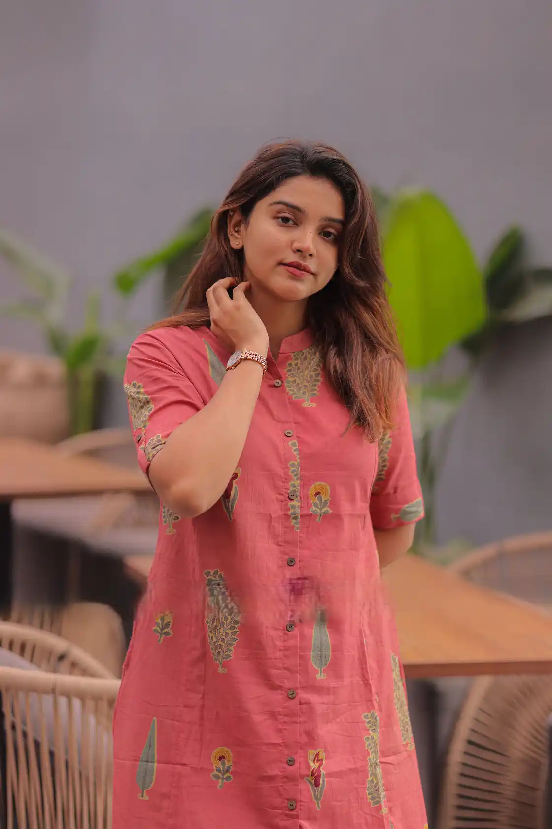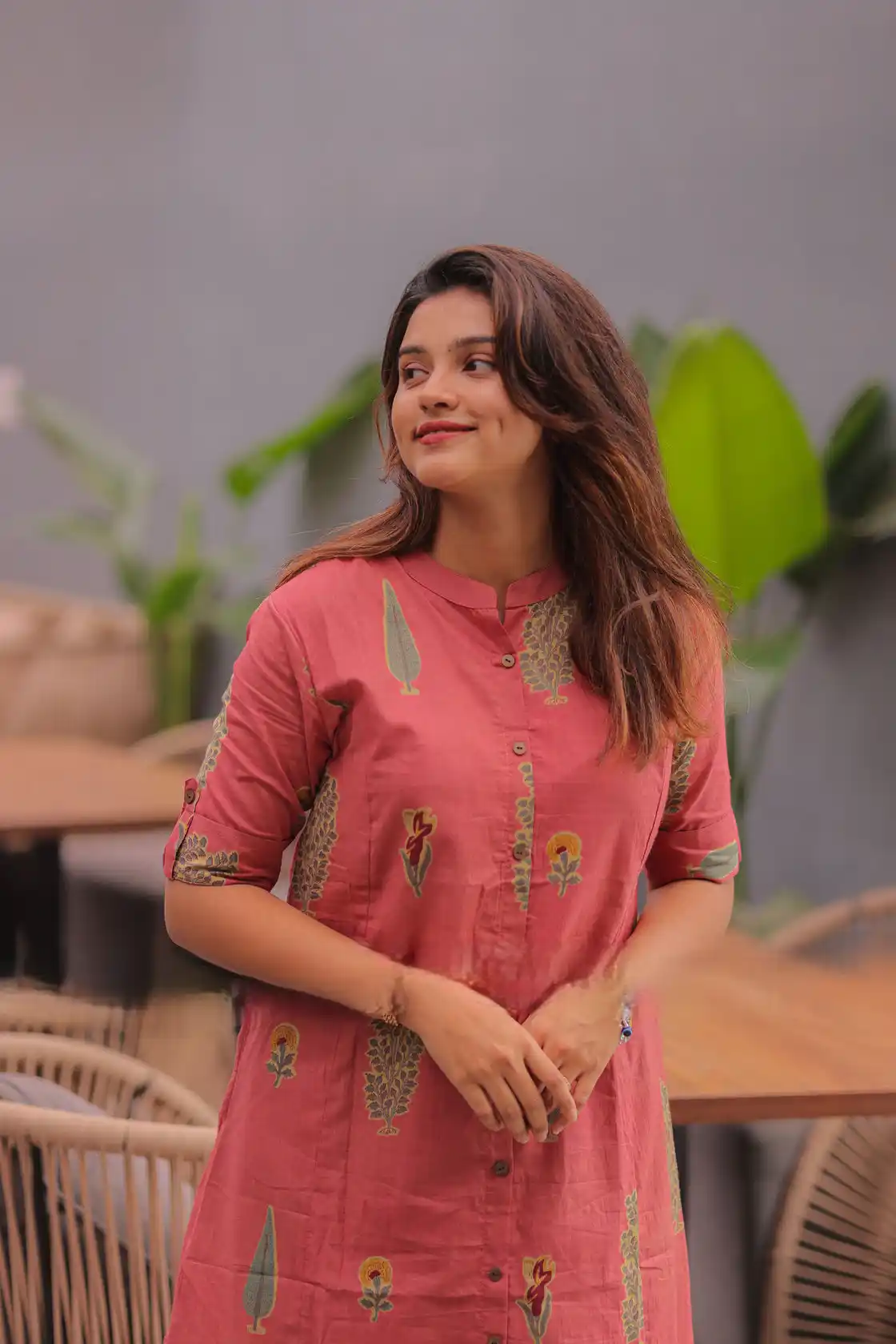 Dusty Rose Pink Floral & Leaf Block Print Look Kurta with Straight Pant