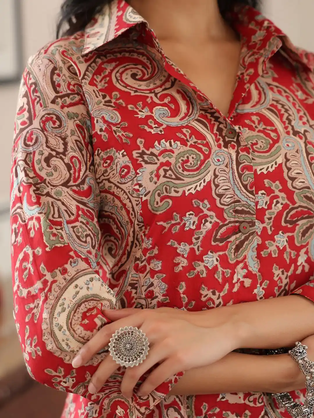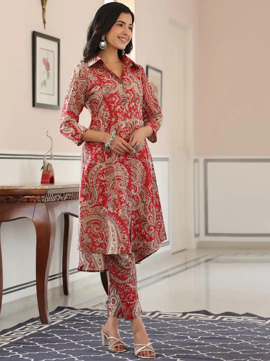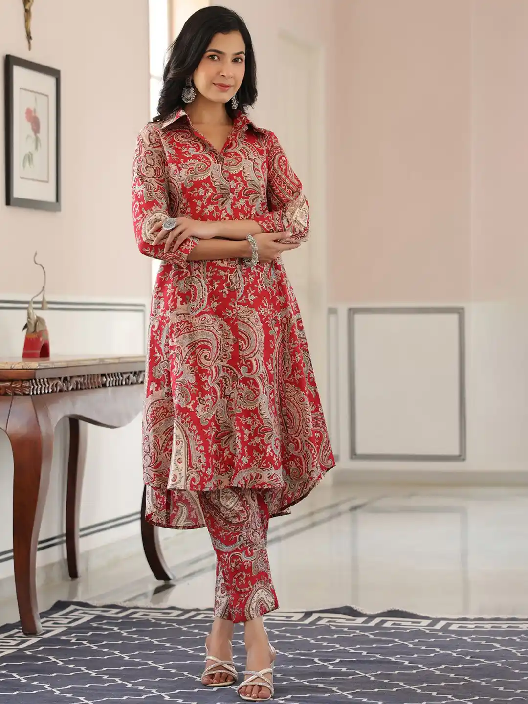 Royal Crimson All-Over Mughal Paisley Print Women’s Printed Kurta with Matching Pants (2-Piece Set)