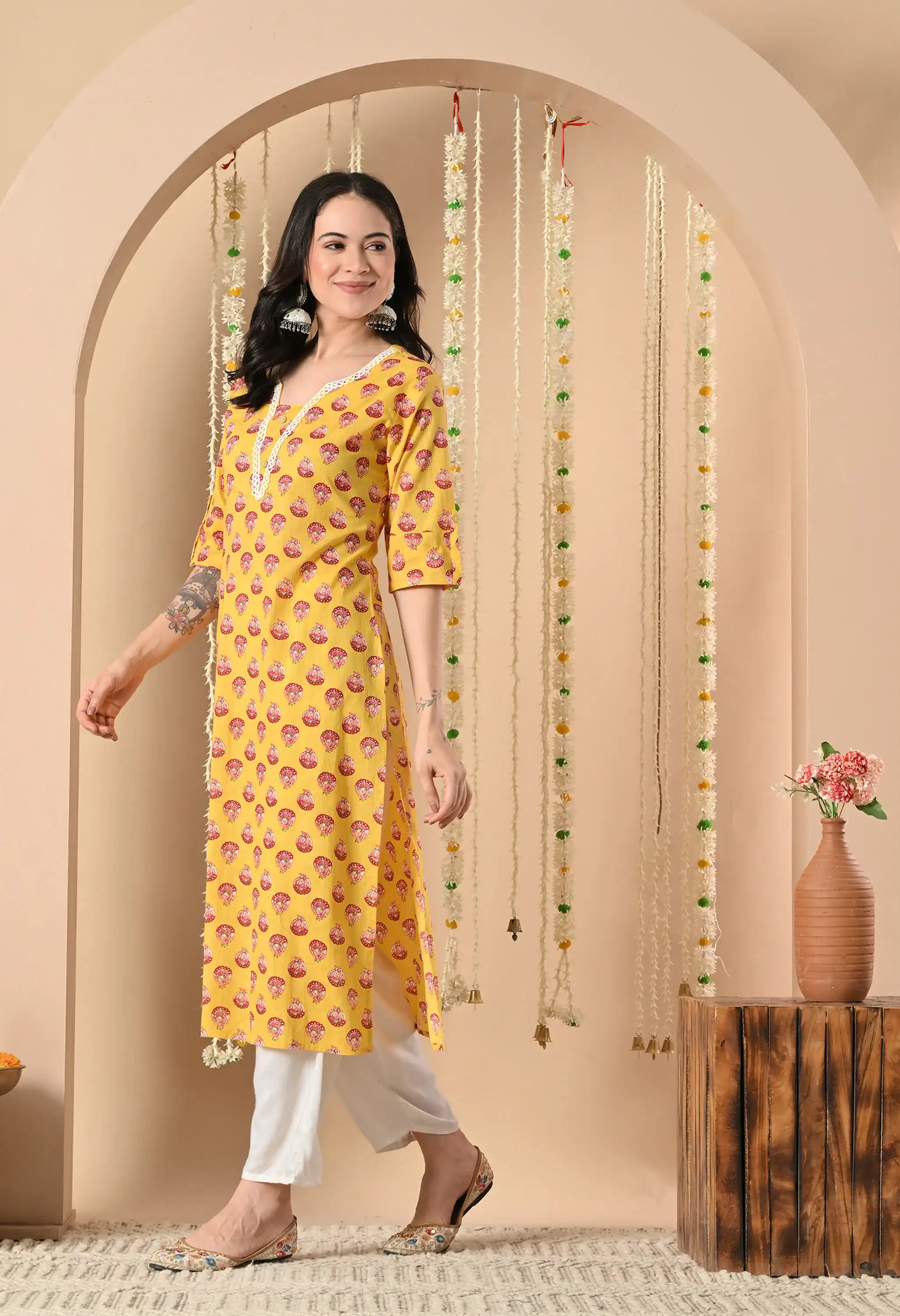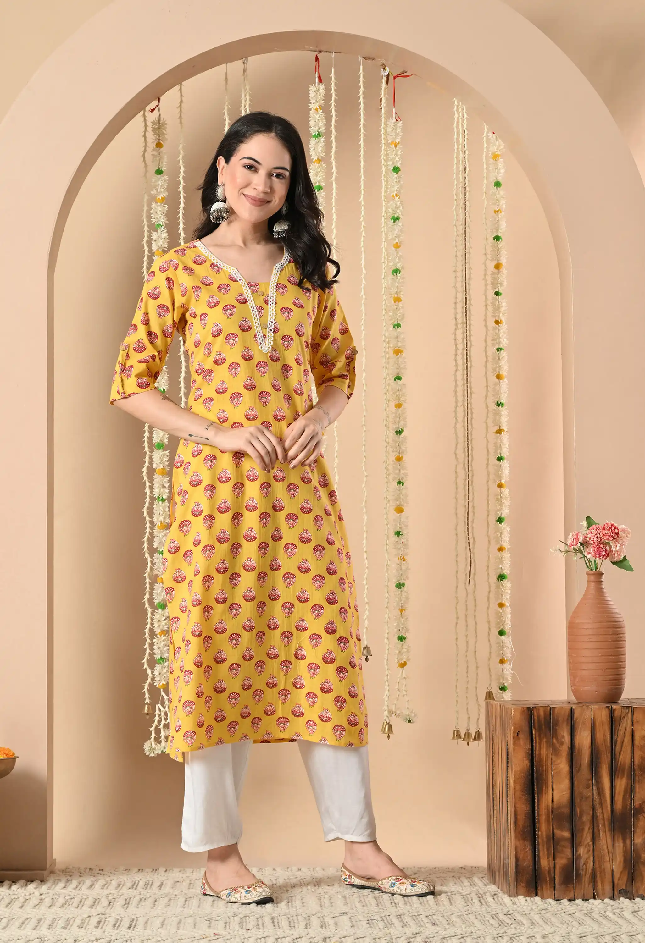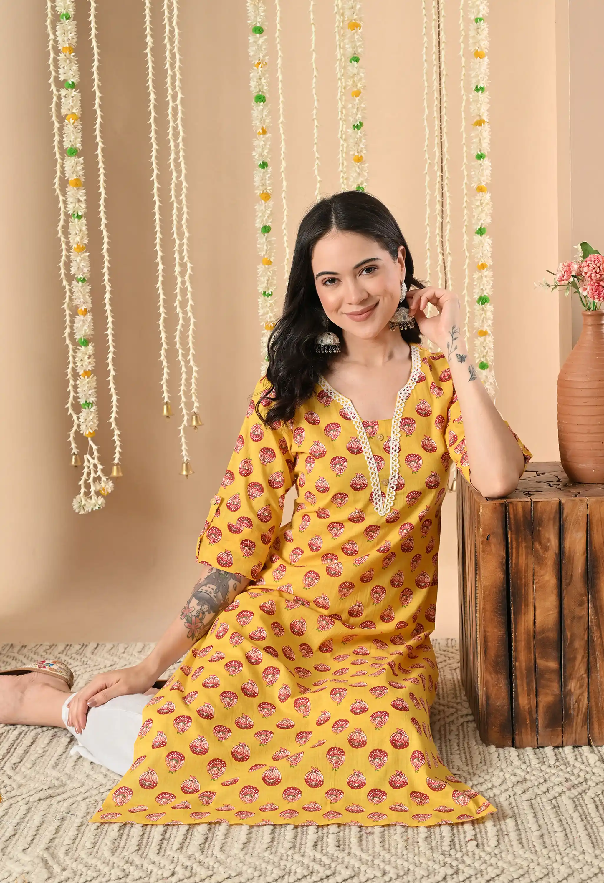 Mustard Yellow hand block printing thread work or lace detailing Woman's Printed Kurta