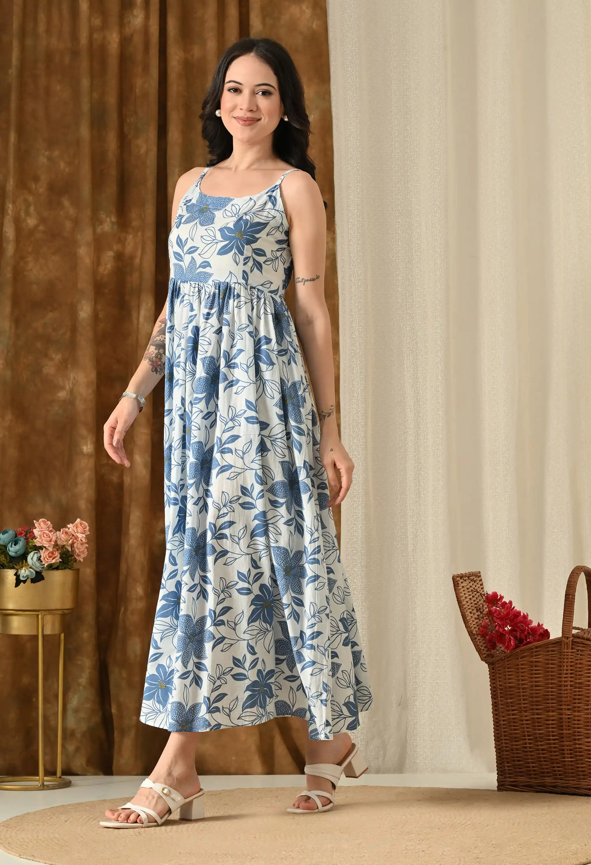 Ivory Sky Blue Indigo Floral Vine Print Women’s Floral Midi Dress